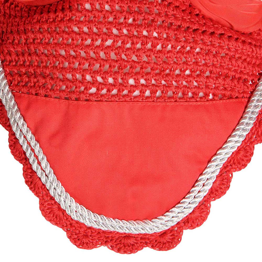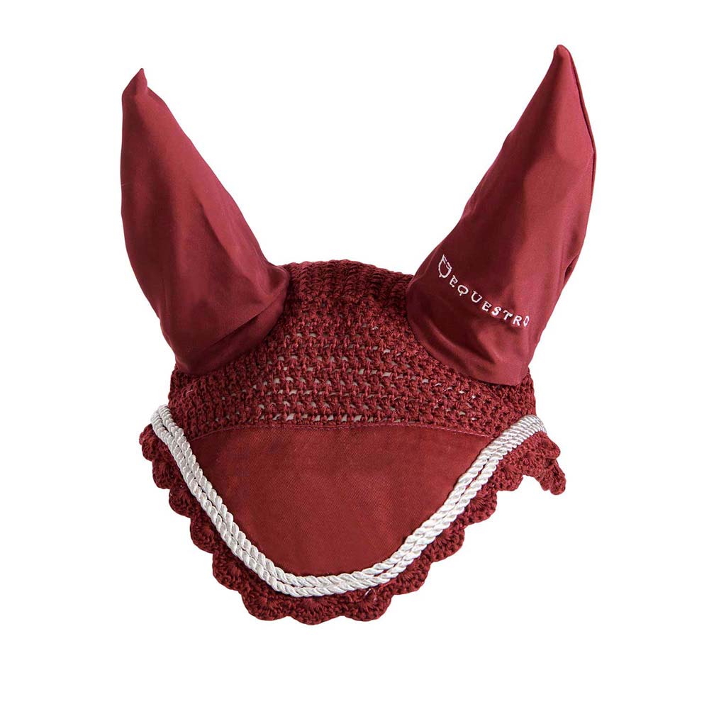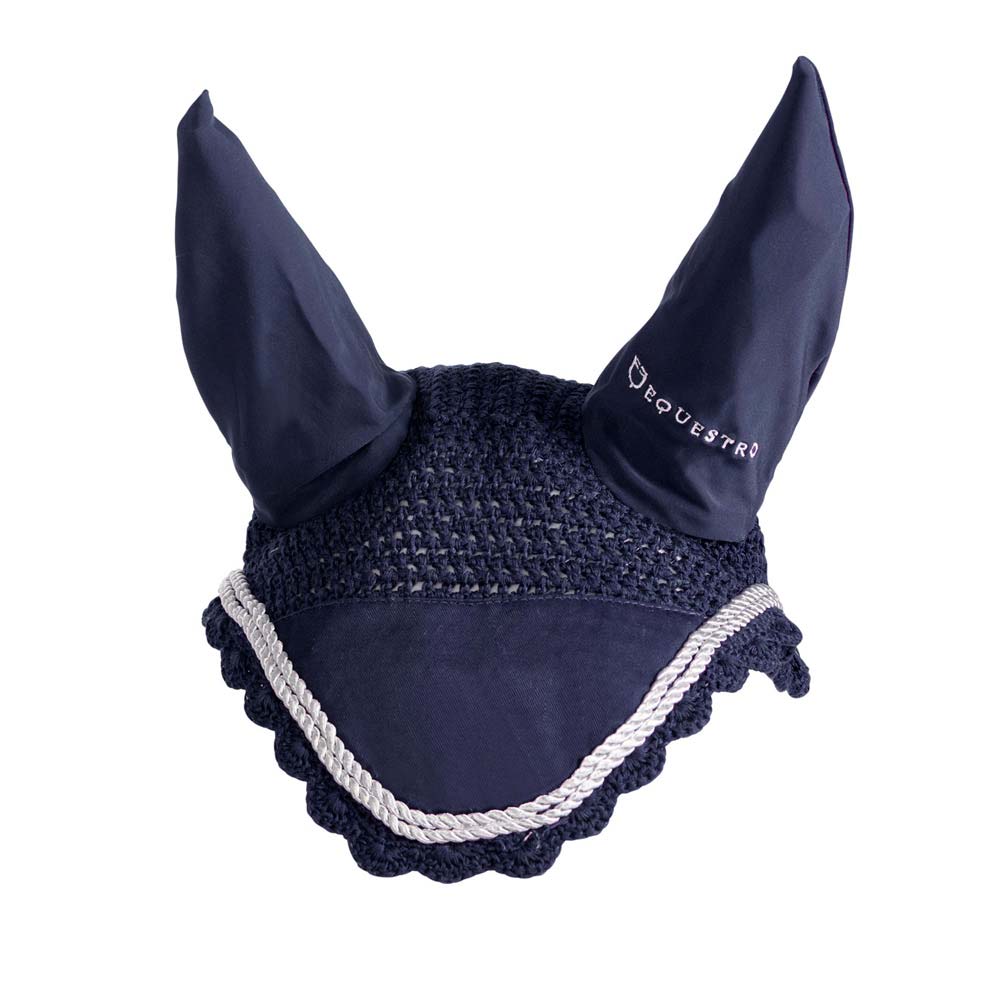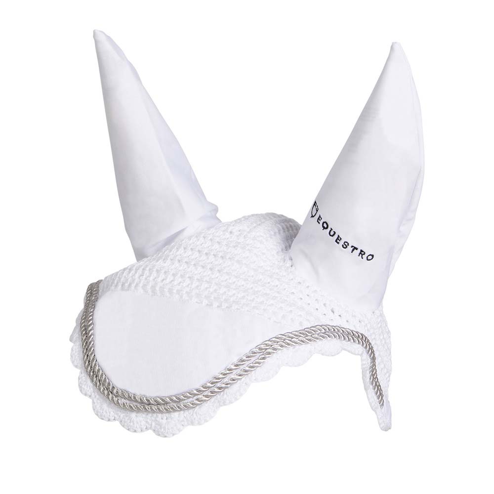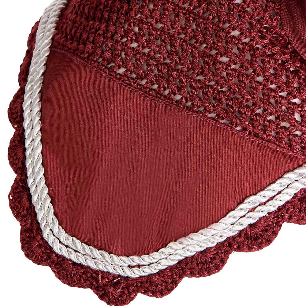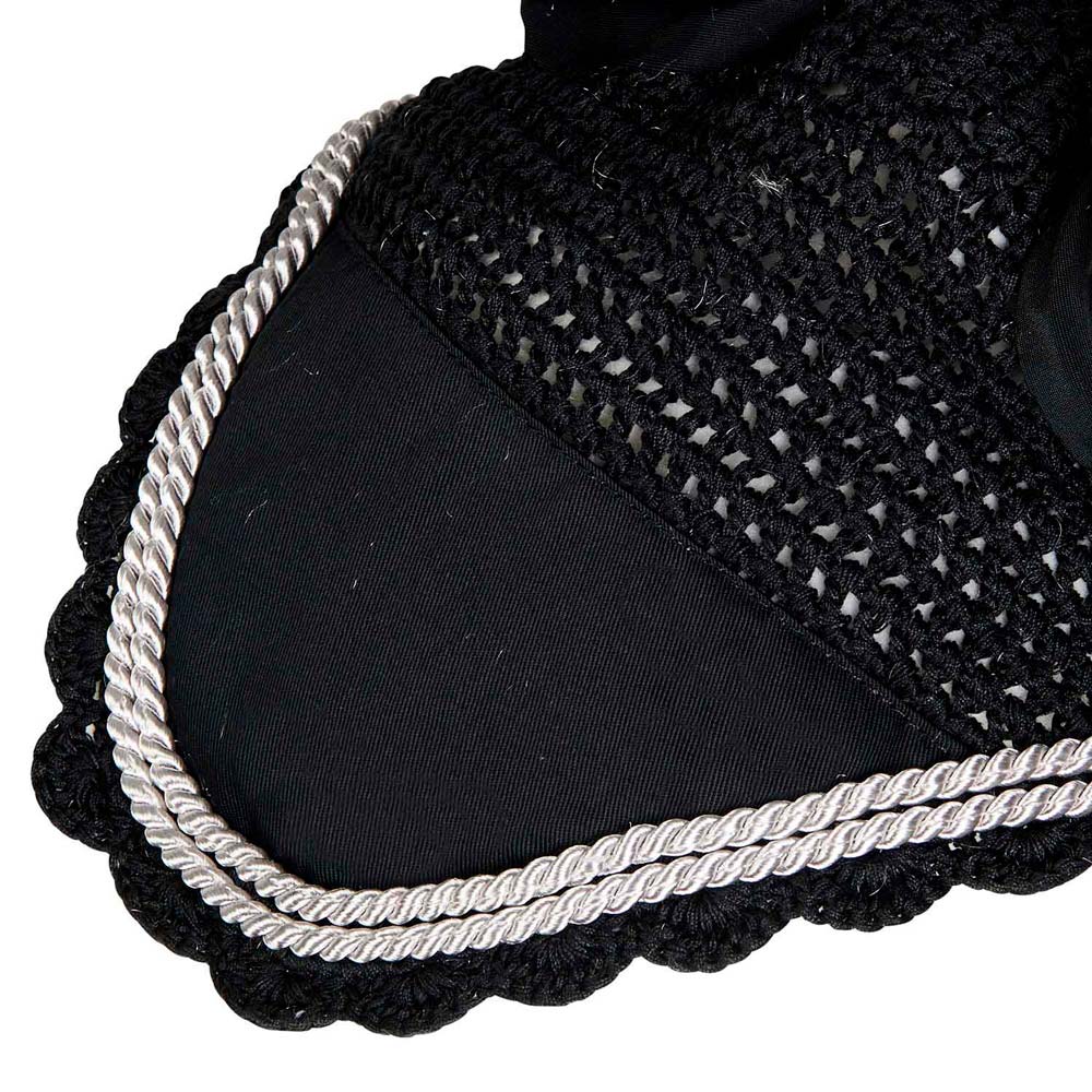 Práctico mosquero, con cubierta antimoscas para la cabeza confeccionada en algodón con adorno de pasamanería tipo cordón de color gris plata y con cubrimiento en tejido elástico para proteger las orejas de tu caballo.