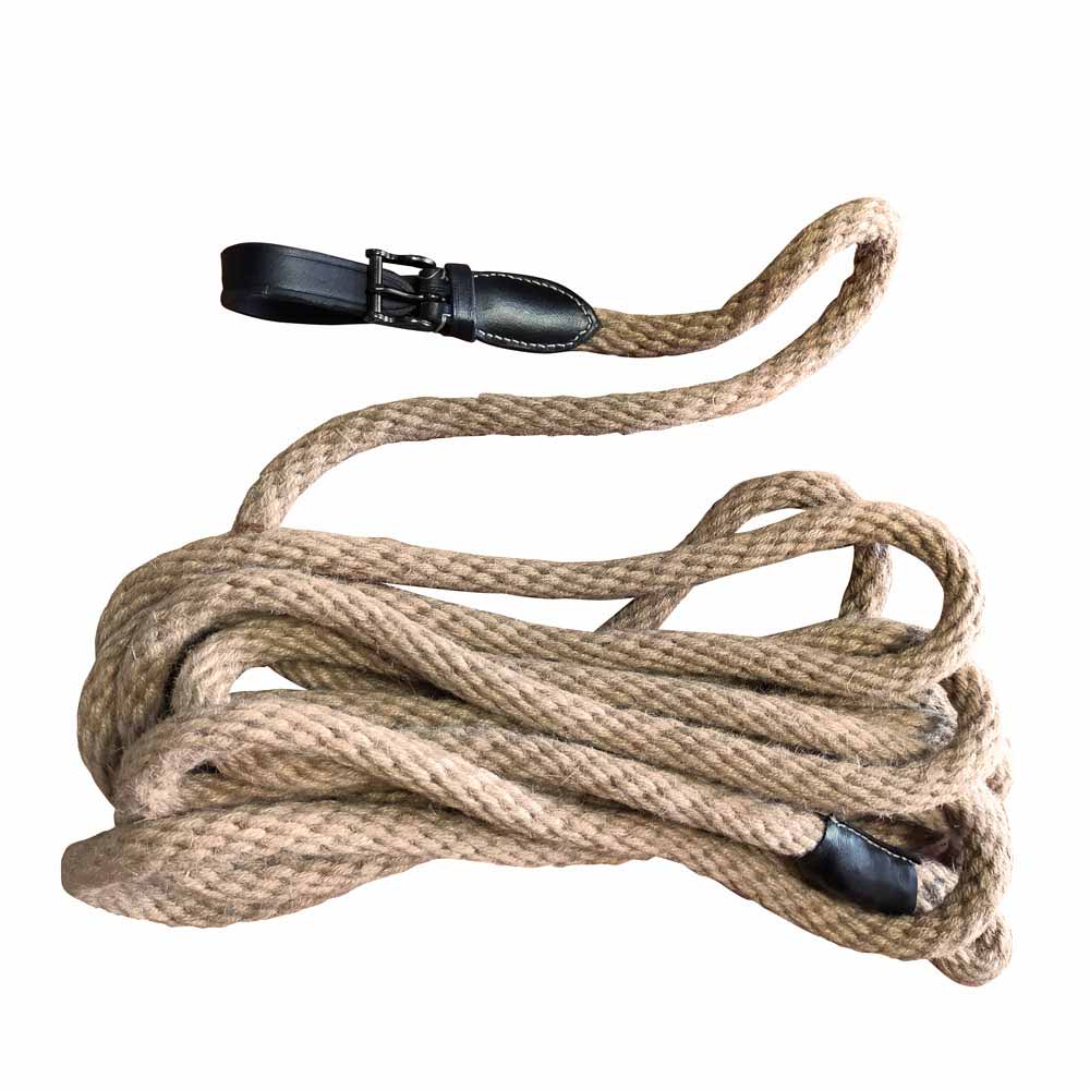 Ramal de presentación en cuerda de cáñamo trenzado y cuero. Se abrocha con hebilla. Hebillaje cromado pavonado. Longitud: 6 metros aproximadamente Grosor: 1.5 cm